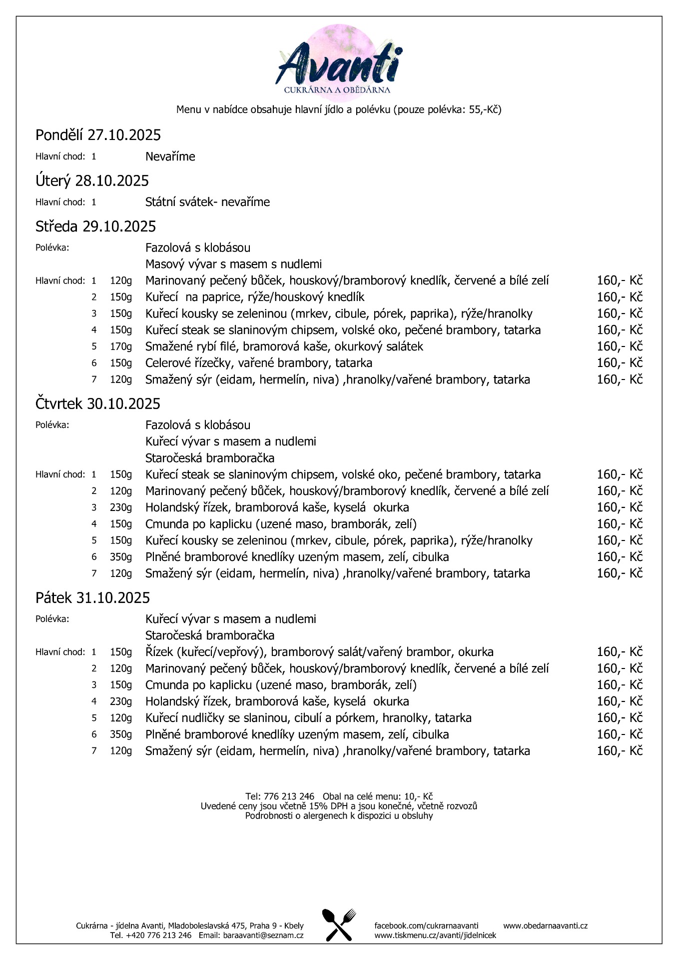 Polední menu pro Vás připravujeme každý všední den a můžete si ho vychutnat u nás, nebo si oběd nechat připravit s sebou a nabízíme i možnost rozvozu jídel