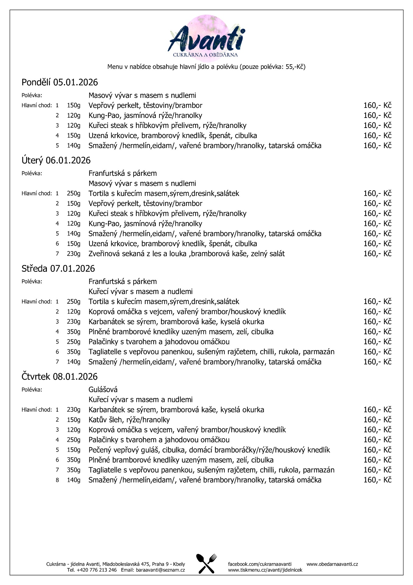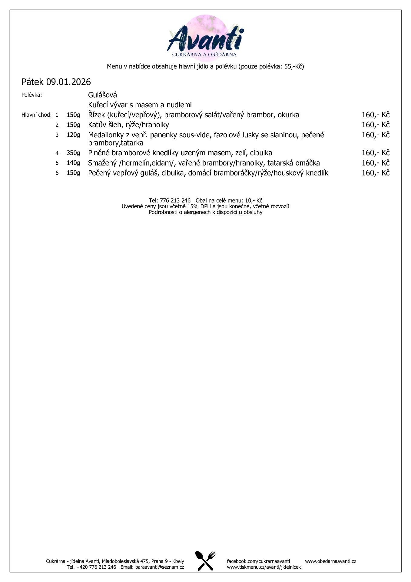 Polední menu pro Vás připravujeme každý všední den a můžete si ho vychutnat u nás, nebo si oběd nechat připravit s sebou a nabízíme i možnost rozvozu jídel